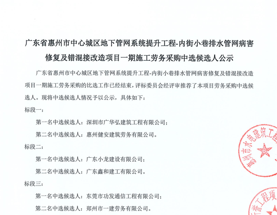 廣東省惠州市中心城區(qū)地下管網(wǎng)系統(tǒng)提升工程-內街小巷排水管網(wǎng)病害修復及錯混接改造項目一期施工勞務采購(第二次)中選候選人公示……
